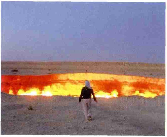大火坑位于土库曼斯坦卡拉库姆沙漠的心脏地带。1971年,前苏联的地质学家在此地钻探,偶然发现了一个充满天然气的洞穴。不过,钻探导致地面坍塌,形成了一个直径70米的大坑。由于担心洞中释放有毒气体,他们决定立即焚烧。原指望大火在几天内耗尽能源后熄灭,但是时至今日,大火还在燃烧。