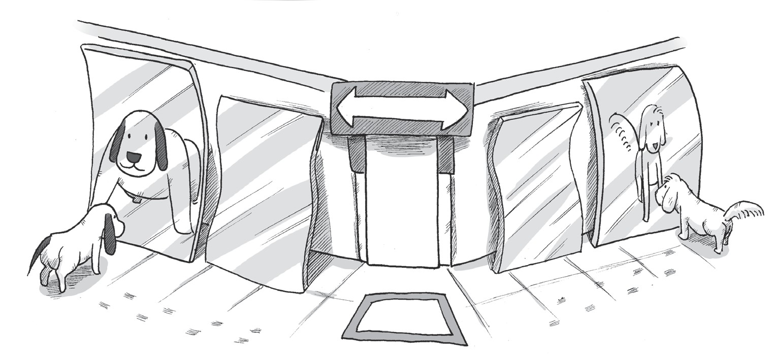 有两只活泼可爱的小狗,一只叫比波,另一只叫蓝波,它们经常在一起玩耍。有一次,它们听说在公园里有一种镜子叫哈哈镜,就怀着好奇的心决定一起去看个究竟。