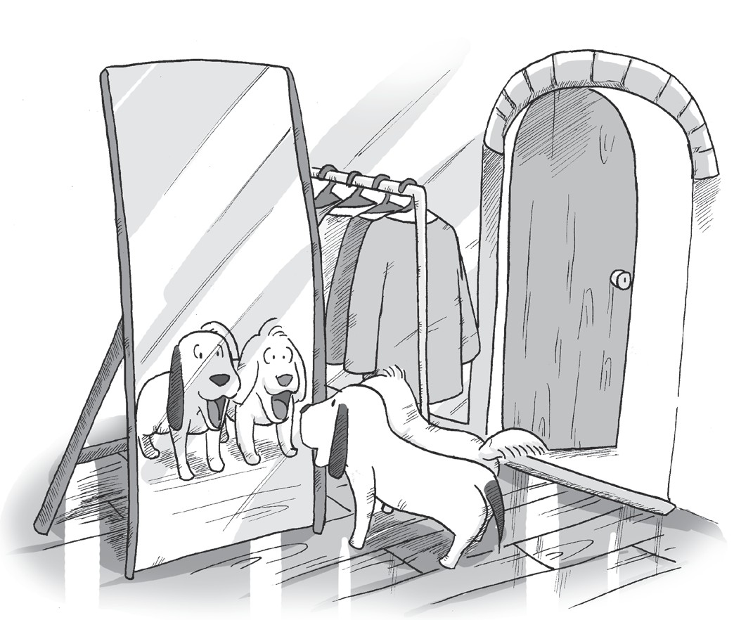 比波走啊走,突然发现一面镜子,镜子上半部分向下凹着,比波看到镜子里有一只高大魁梧的狗,比波向镜子里的狗挥挥手打招呼:“你好,请问你叫什么名字?”镜子里的狗也向它挥挥手,仿佛也在和它打招呼。