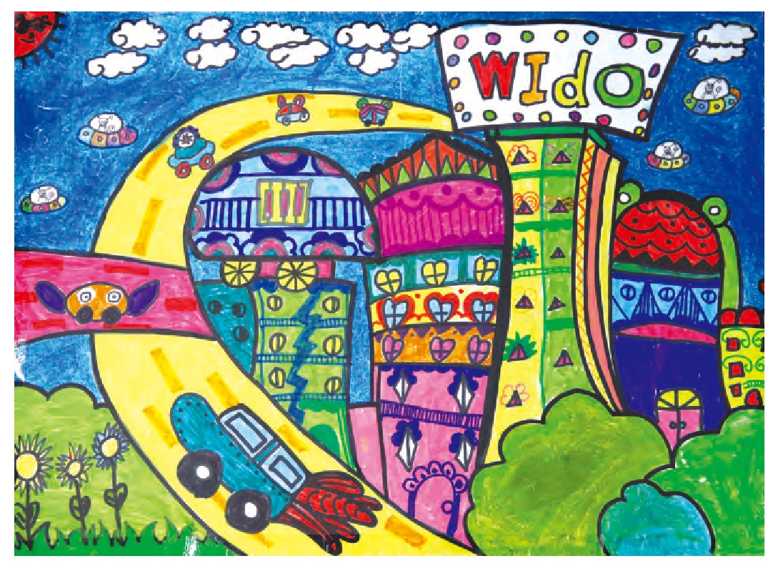 这是我设计的未来的新城,城市里的街道都是飘在空中的,小汽车也都有翅膀。街道两旁是高科技的楼房,它们的窗户都经过特殊处理,除了造型别致外,还有不同功能。如三角形窗户主要是防护功能,而半圆形的窗户可以方便车辆停靠。