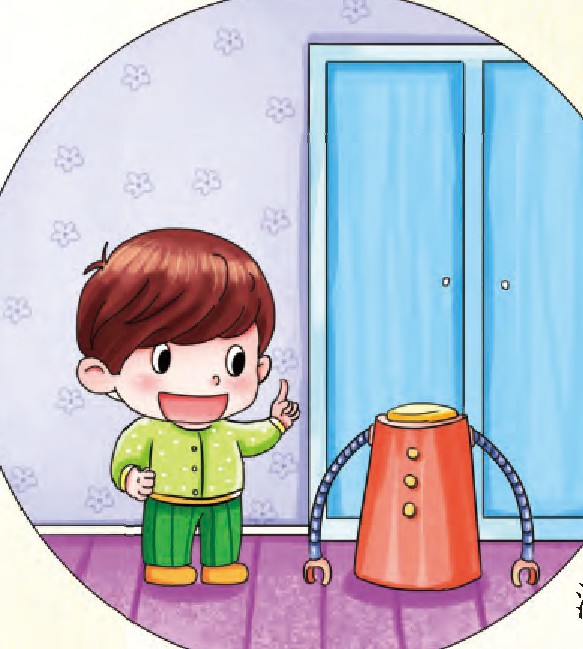 我发明的清洁机器人有一双长长的胳膊,在它的肚子上还分布有红、黄、绿三个按钮。家里地板脏了的时候,你只要按下红色按钮,清洁机器人就会拿起扫帚和拖把,帮你把地板打扫得一尘不染。家里的窗户脏了,你只要按下黄色按钮,清洁机器人就会拿起抹布,用长胳膊仔仔细细地擦洗玻璃,任何角落都不会放过。家里的东西乱了,别着急,只要按下绿色按钮,你就能舒舒服服地坐看清洁机器人把家里整理得井井有条。