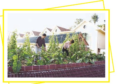 高高的塑料栅栏围起的培植槽内种着各种青菜、豆角、黄瓜等蔬菜,青青的藤蔓爬上搭起的竹架,远望一片绿色覆盖着整个楼顶。职工们利用休息时间到屋顶农场去培土、浇水;公司开例会时,经常摘一些番茄、黄瓜等瓜果给同事们当食品;每个周末,公司安排人员挑些青菜、辣椒和茄子给职工带回家……