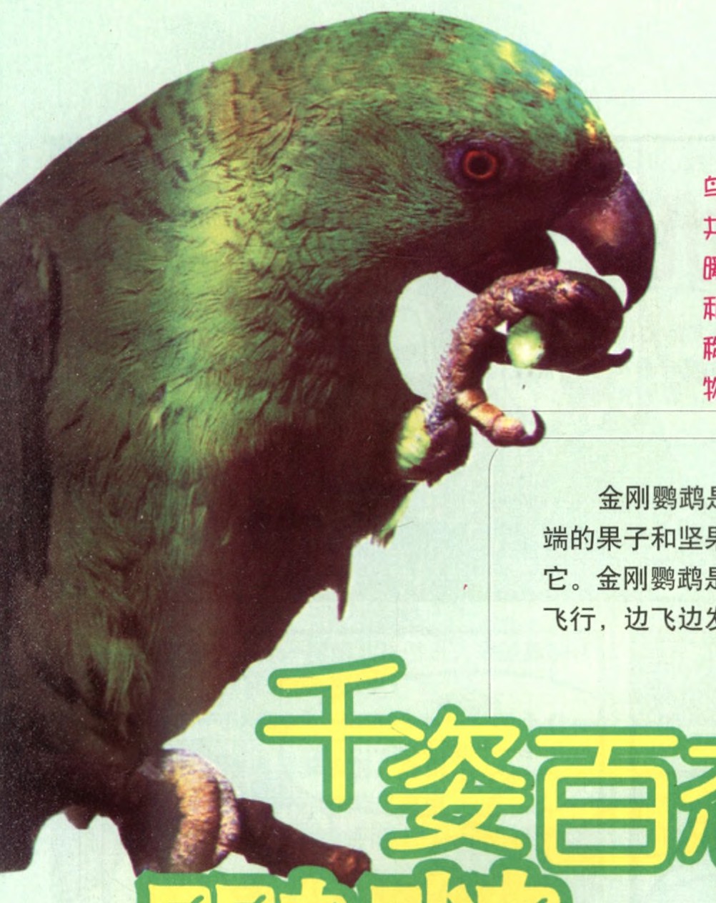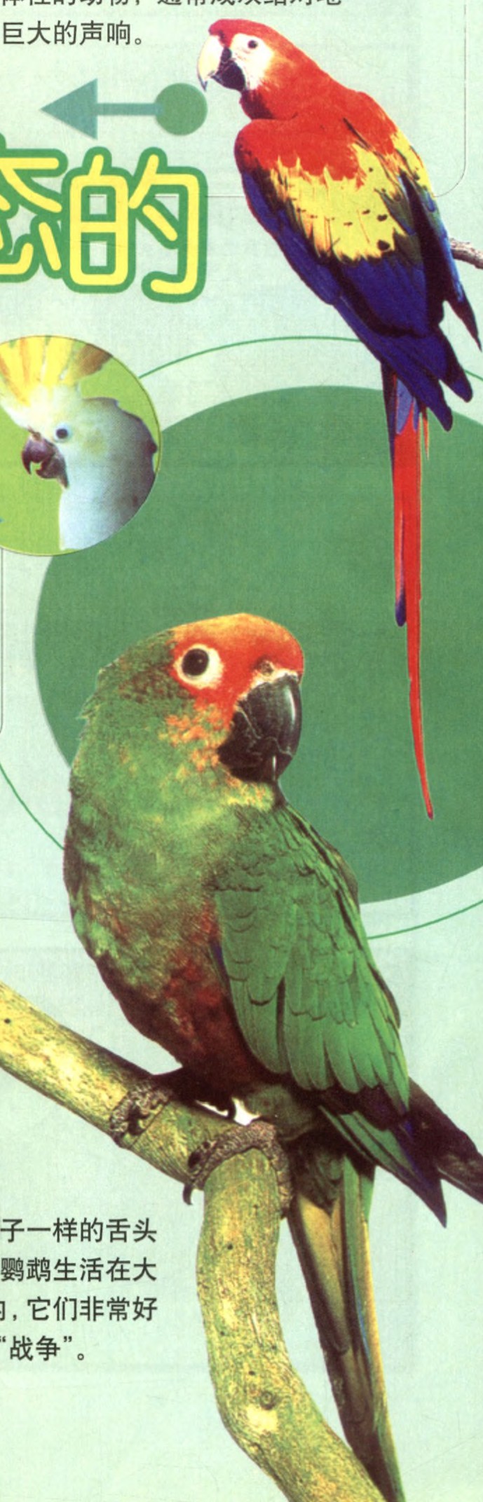 鹦鹉是世界上最华丽、最会鸣叫的鸟类,但有些种类已濒临灭绝。全世界共有330多种婴鹉,几乎全都生活在温暖的地区。它们以植物为生,擅长飞行和爬树。它们通常会攀到树顶上,一边移动它们有力的双足,一边用嘴衔住食物——这在鸟类中是很少见的。