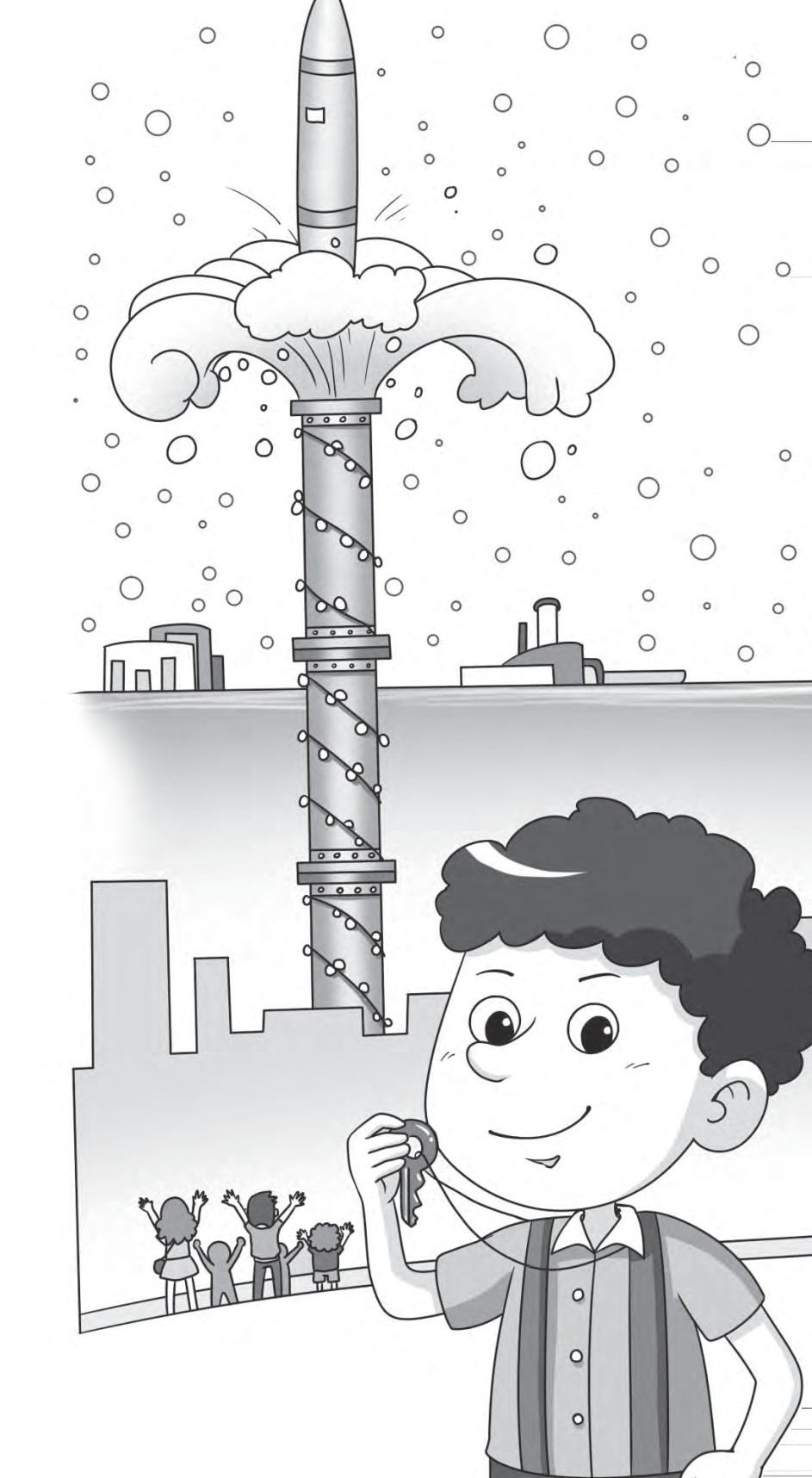 不久,一切准备就绪,特制的防水型长征号火箭一声巨响冲出海底大管子直插云霄。汹涌的海水随着火箭一齐喷涌而出,然后落到海面上的发电机上,发电机立刻飞转起来,海底一片光明。