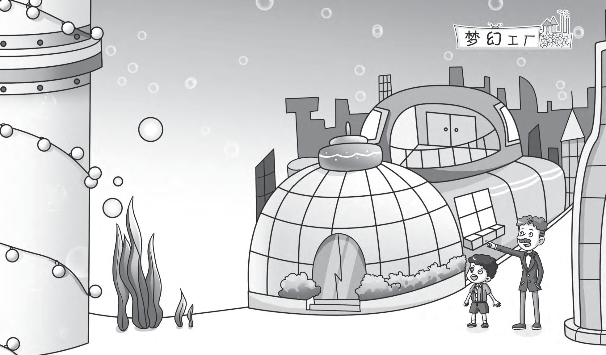海底新城和陆地城市一样,马路、商店等各种公用设施应有尽有,不同的是这里像一个水晶般的世界,一尘不染,静谧无声。最吸引大脑瓜眼球的是城外不远处有一根顶天立地的大管子,这根大管子直径有200多米,是用一种透明的特殊材料制成的。管子上盘绕着无数盏五颜六色的彩灯,不停地闪烁着。