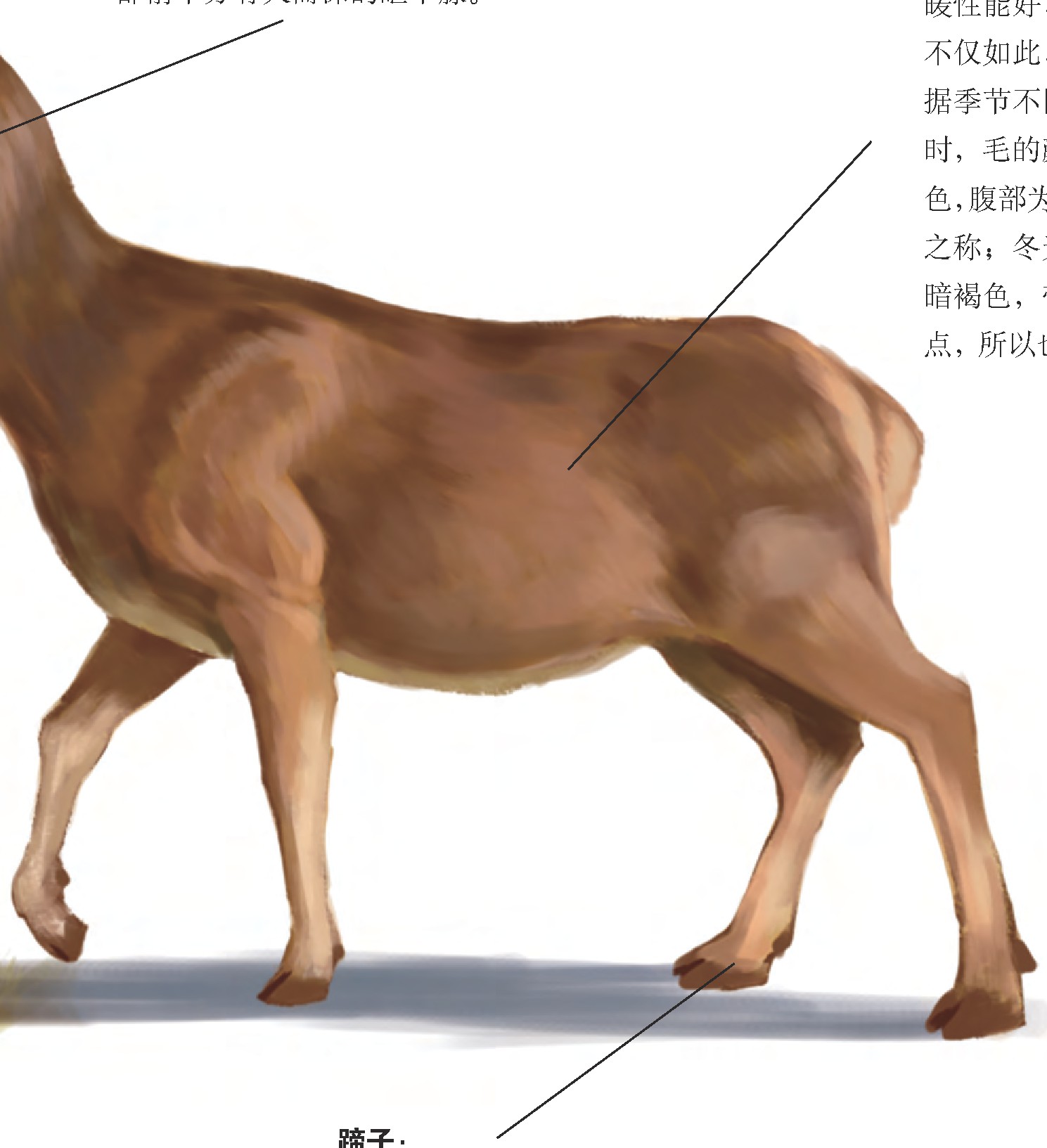 我的体毛长而粗硬,保暖性能好,可以抵抗风雪。不仅如此,毛的颜色还会根据季节不同发生变化。夏天时,毛的颜色较深,呈黄褐色,腹部为浅黄色,有“黄鹿”之称;冬天时,毛的颜色为暗褐色,带有淡栗色的小斑点,所以也被叫作“红鹿”。