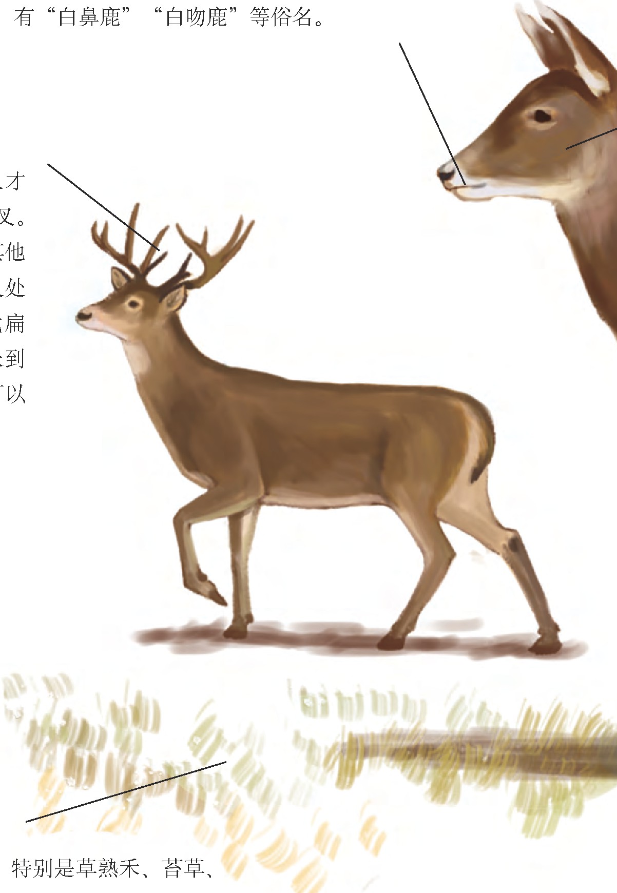如果你第一眼看到我的正脸,肯定首先会被我的白嘴唇吸引。我有一个纯白色的下唇,白色延续到喉上部和吻的两侧。所以,我不仅有“白唇鹿”这个学名,还有“白鼻鹿”“白吻鹿”等俗名。