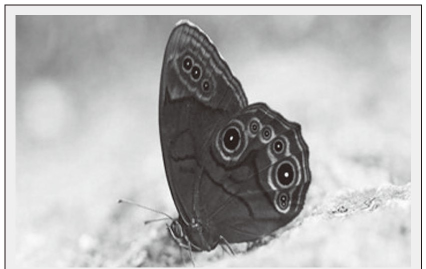 下面这张照片是在我们休息的路上拍摄的。它是眼蝶的一种,小小的、美美的,翅膀上那一只只乌溜溜的眼睛正是眼蝶的特征。这可不是卖萌,当天敌来临时,这几只大大的眼睛足以震慑到敌人!楼爷爷说,这叫拟态,而且不单是蝴蝶,许多昆虫都具有这种本领。