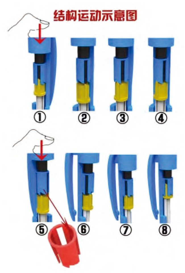 这个小部件由黑色的顶杆、黄色的转盘和蓝色的滑槽构成,与自动笔里的弹簧配合使用。顶杆头部几道尖尖的特征在与转盘的斜面接触时会产生径向力从而强迫转盘旋转,但滑槽是隔一个尖尖有一个,因此按一次笔芯会卡住,再按一次笔芯会滑入滑槽,从而达到收回来的效果。