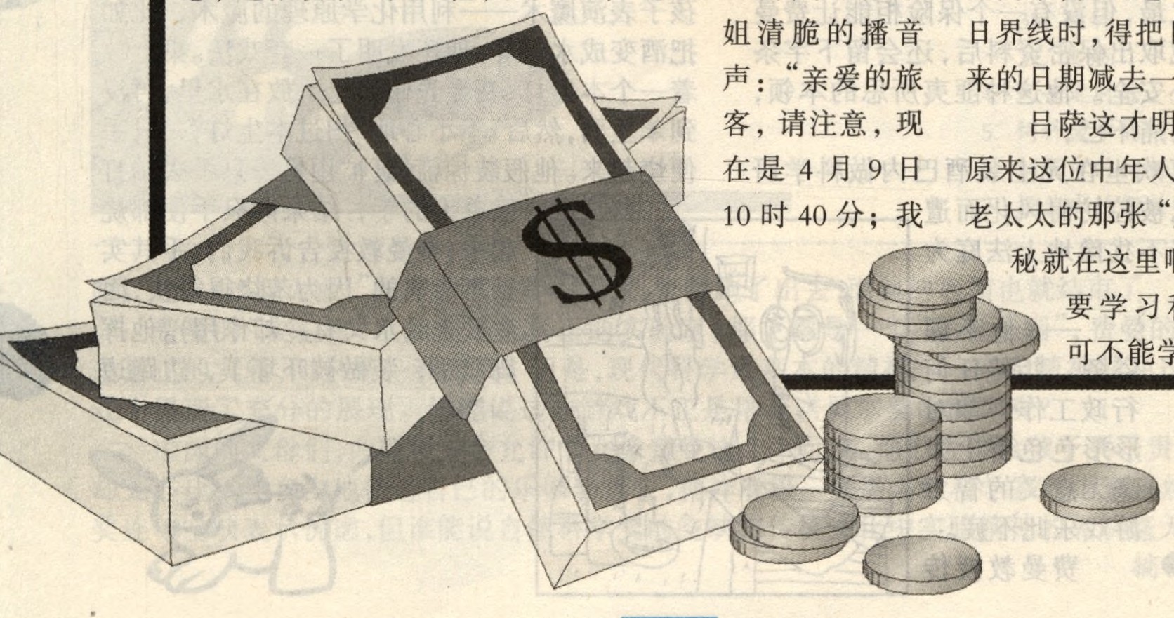 飞机将要起飞,中年人拿着那张废彩票和旅客一同上了飞机。班机腾空而起,一会儿耳边传来领航小姐清脆的播音声:“亲爱的旅客,请注意,现在是4月9日10时40分;我们将在11时于美国的檀香山降落……。”商人吕萨这时为之一震,上飞机时明明是4月10日,怎么一下变成了 4月9日?上飞机前,亲眼看见在银行里出现的事情,不是10日发生的吗?为什么变成了9日,难道时光可以逆转?吕萨回过头去想寻找向老太太购买过期彩票的那位中年人,没想到正坐在自己后面,于是惊异地向他询问:“先生,请问,现在怎么变成9日了?这样一来,你刚才买的废彩票不是又有效了吗? ”中年人面带笑容,十分得意地说:“就是啊,我以3000美元买到的这张中奖彩票,一下飞机就可向檀香山花旗分行领到8000美元呢。”他简直得意忘形了,不时地晃着脑袋,望着吕萨那茫然不解的面孔,又兴冲冲地说:“您忘了吗?我们的旅程正好是自西向东,在飞过180°附近的日界线时,得把日历表按原来的日期减去一日。”