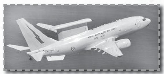 “楔尾”实非澳大利亚研制,只是澳军方选中了波音公司研制的“楔尾”作为自己的预警机。“楔尾”以成熟的波音737为平台,上面整合了多功能电扫描相控阵雷达。其雷达天线布局很特殊:一块天线像“背鳍”一样垂直安装在后机身上(两侧各扫描120度),另一块像搭积木似的水平安装在“背鳍”上部(纵向前后各扫描60度),这样就构成了一个完整的天线阵,可360度扫描。