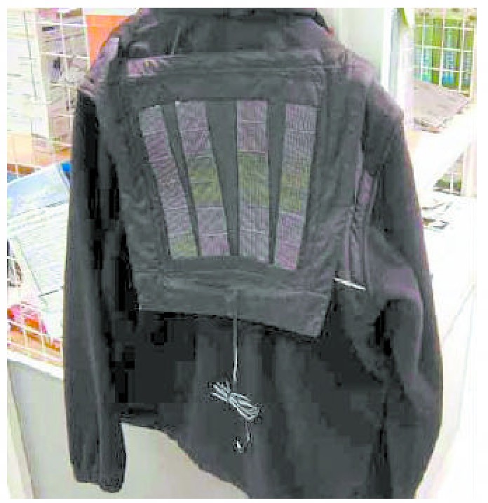 美国研究人员发明了一种新型的太阳能夹克。在那些阳光灿烂的日子里,穿上一件太阳能夹克,把我们的那些小电器放在衣兜的插槽里,就可以一边散步一边为这些电器充电。这种新型的太阳能衣服能够给随身携带的手机、掌上电脑、MP3播放机、游戏机等电子产品充电,并且可以同时给多个电子产品充电。这件夹克的背部有几块醒目而时尚的“补丁”,那就是为小电器提供电能的太阳能充电板。人们可以一边在户外活动,一边为随身的小电器充电。这些太阳能板还可以拆下来单独使用,比如你在办公室或者家里的时候,就可以把这两块电池板放在窗台上让它们充电。在阳光直射条件下,充电时间一般为2~3小时。太阳能电池板“补丁”很薄,富有弹性,质量轻,效率高。除了那些喜欢户外活动的用户外,这款太阳能夹克更适合在海洋、沙漠环境中生活的居民、士兵和技术人员使用。