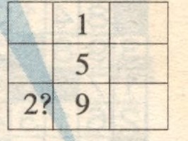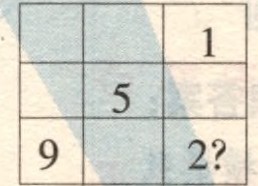 中间方格最重要,被包含在4个数组中(两个对角线,一横行,一竖列)。观察上述各数组,发现只有数字5出现在4个数组中,因此中间方格的数就一定是5。4个角上的数字将被包含在3个数组中。观察上述各数组,发现2,4,6,8这4个数都出现了 3次,因此4个角上的数字必须是偶数。这样我们就很快得到解答。