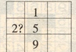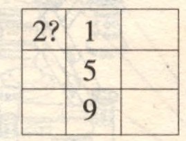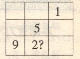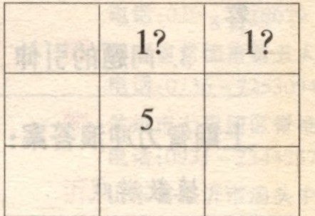 下面考虑在这9个方格中哪一个最重要?显然是居中的那一个。我们就把注意力先集中在这个方格上。把1~9个数分别试放在这个方格上。如果把9放在中间方格,行不行呢?不行。因为这时无法放置8,无论把8放到哪里,都得把9和8加起来,而其和已超过15。依同样道理,8、7、6也不能放在中间方格。1是不是可以呢?也不行。因为这时2无论放置在什么地方,而为了使行、列、对角线上的数字之和为15,必须加上12。同理2、3、4也不能放在中间方格。唯一能放在中间方格的只有5。