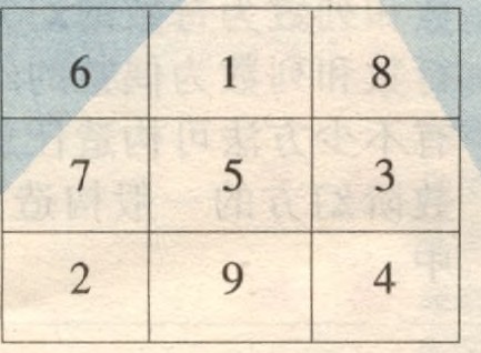 由于图2这种3×3方阵的美妙性质,引起人们的极大兴趣,后来发展到4×4, 5×5,……方阵。我国宋朝数学家杨辉把它们称为纵横图,国外称为幻方。幻方的阶数是由行或列的数目来确定的,图2的幻方的阶数为3。行数和列数为奇数的幻方称为奇数阶幻方;如果行数和列数为偶数的幻方称为偶数阶幻方。已有不少方法可构造任意大小的奇数阶幻方;偶数阶幻方的一般构造方法,人们还在探求之中。