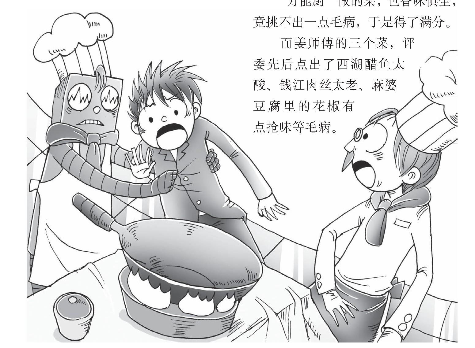 有一个老厨师姜师傅轻蔑地说:“它只是一台机器,何必对它客气啦!”不料机器人马上答了腔:“请注意文明用语,我与你们一样,也是厨师。”