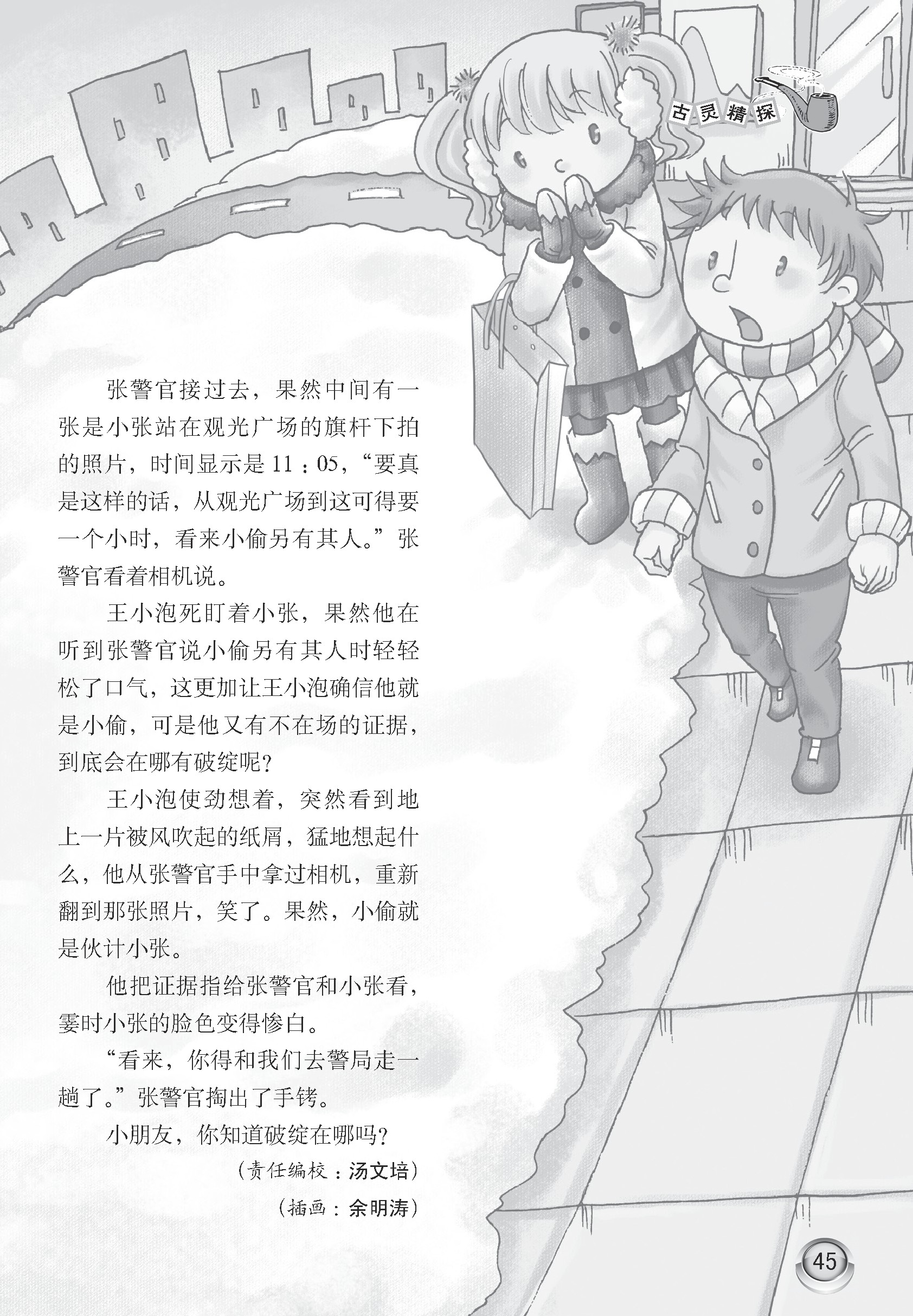 张警官接过去,果然中间有一张是小张站在观光广场的旗杆下拍的照片,时间显示是11:05,“要真是这样的话,从观光广场到这可得要一个小时,看来小偷另有其人。”张警官看着相机说。