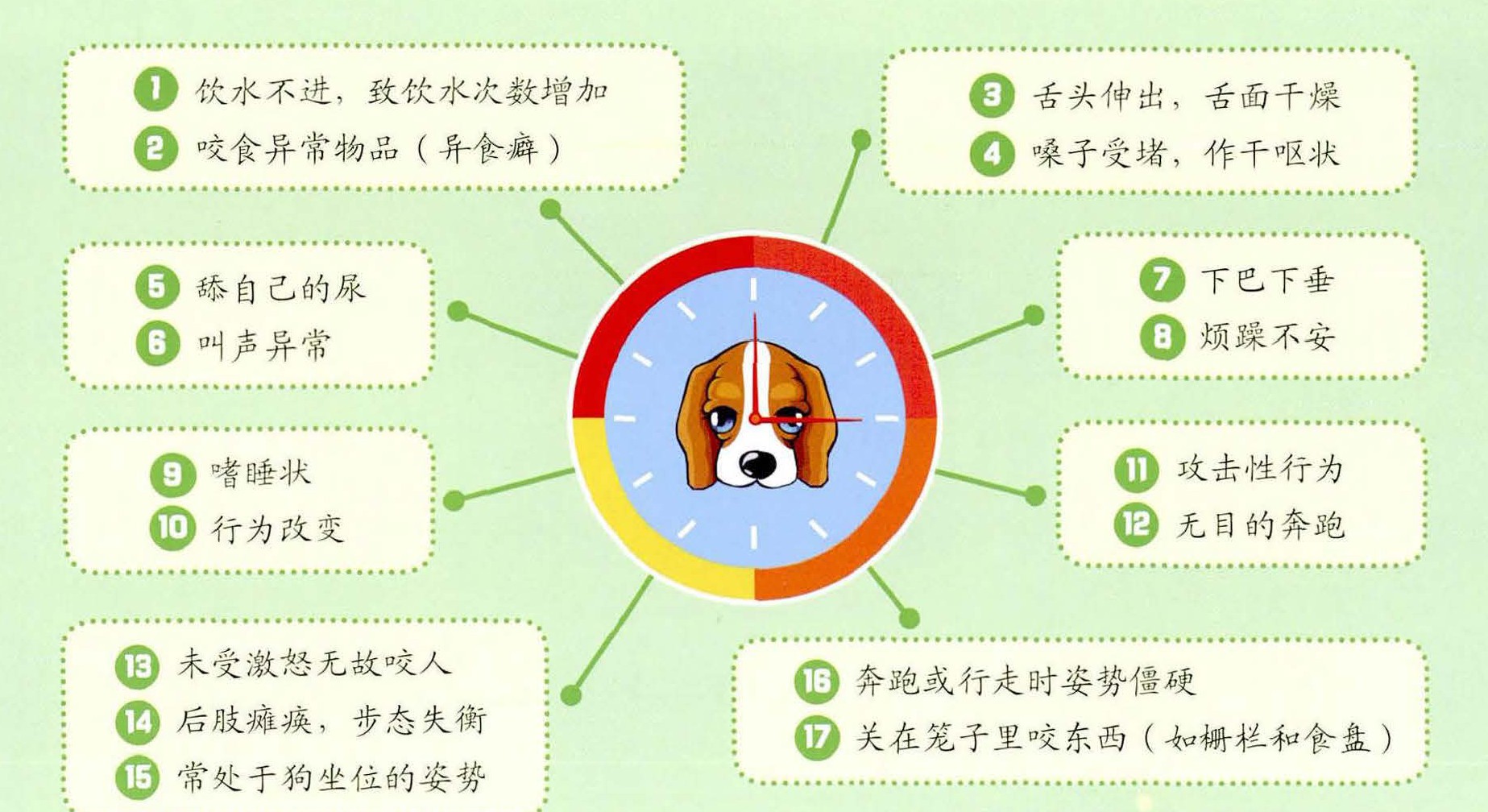 如果狗狗在死亡前一周,出现下列的17种症状、体征中的2种或更多,则有可能是狂犬病。