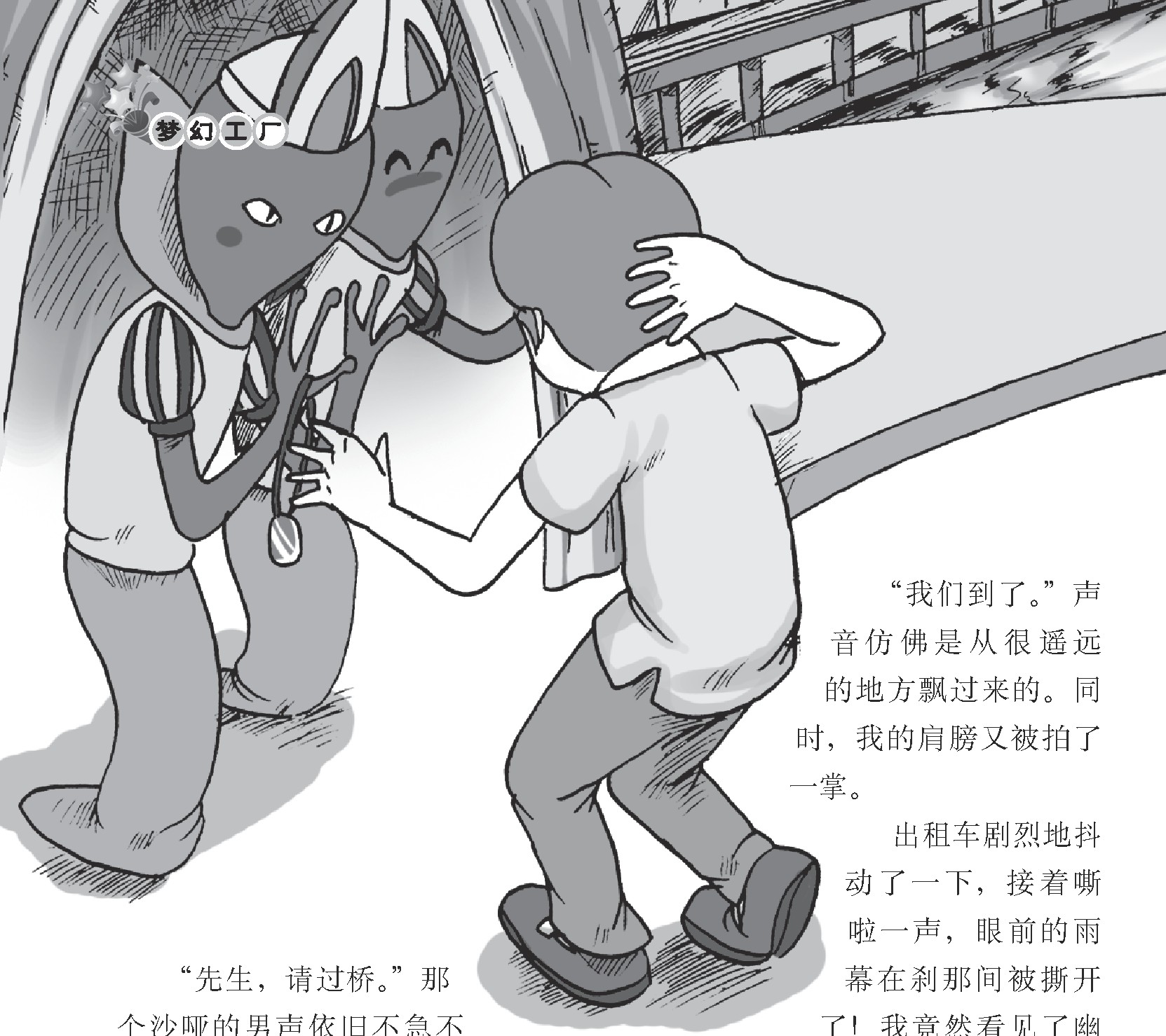 “先生,请过桥。”那个沙哑的男声依旧不急不慢地说道,同时有一只瘦骨嶙峋的手在我的肩膀上拍了一下。