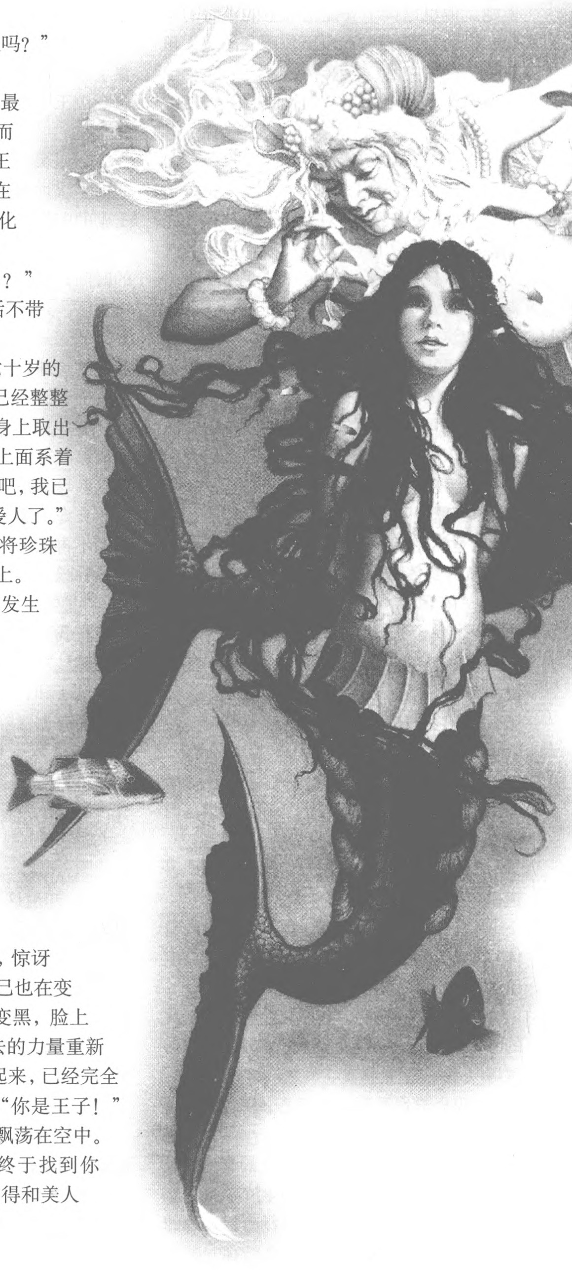 国王看着眼前的一幕,惊讶得说不出话来。然而他自己也在变化,花白的须发已经完全变黑,脸上的皱纹也消失了,曾经失去的力量重新回到了身体里面,他站了起来,已经完全变成了一位翩翩美少年。“你是王子!”美人鱼呼喊了一声,眼泪飘荡在空中。