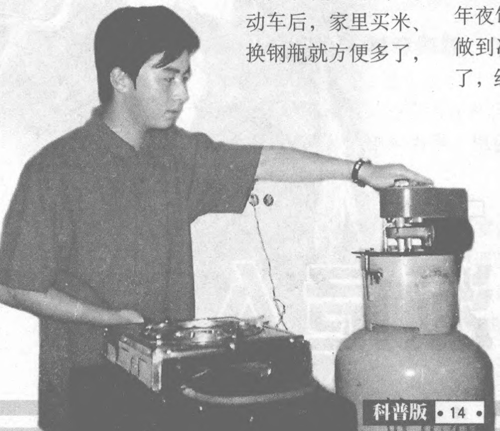上中学时,有一次他到外婆家去,一进屋就闻到一股异味,是液化气泄漏,而外婆却全然不知。他又想到爸妈每天晚上都要检查钢瓶的阀门是否关上,于是萌发了做一个“钢瓶自动关阀机”的念头。