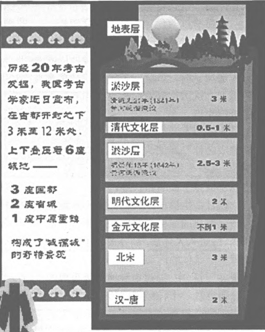 历经20年考古发掘,我国考古学家近日宣布,在古都开封地下3米至12米处,上下叠压着6座城池,其中包括3座国都、2座省城及1座中原重镇,构成了“城摞城”的奇特景观。“开封城,城摞城,地下埋有几座城”,这个一直流传在开封民间的神秘传说终于被考古证实。