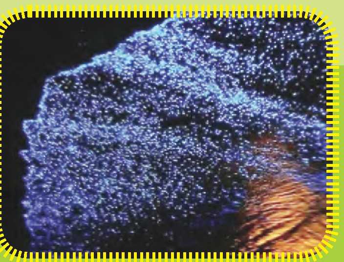 夜晚一片漆黑寂静的海水中,有时会泛起—些亮晶晶的白点,搅动一下,这种银白色亮点会更多。以前渔民称它们为“神灯”,其实这并不是“神灯”,而是一些低级藻类如夜光藻、鞭毛藻、多甲藻、裸环藻等发出的光亮。当浪潮搅扰时,它们会在潮头浪尖点起无数盏“明灯”,退潮后又会在海滩上留下点点星光。如果一只海鸟身上携带了含有这种藻类的水珠展翅腾空时,你会以为那是夜间航行的飞机呢!