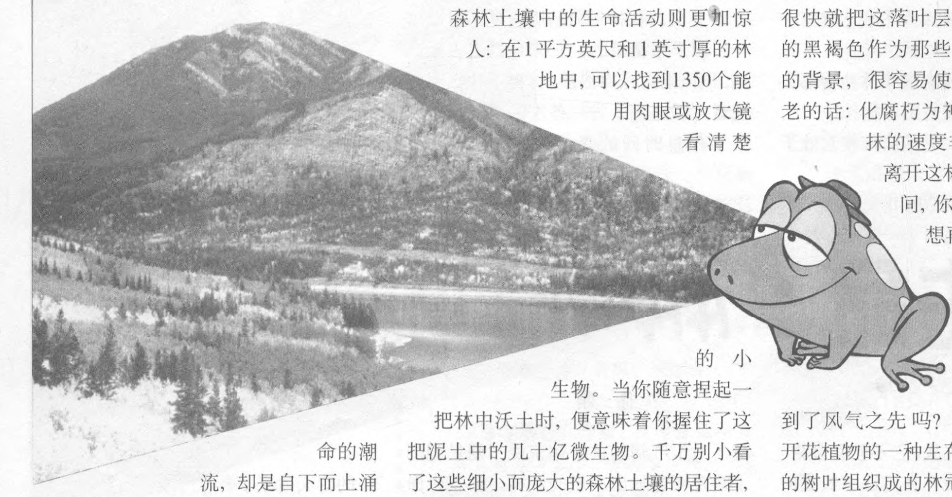 森林土壤中的生命活动则更加惊人:在1平方英尺和1英寸厚的林 地中,可以找到1350个能用肉眼或放大镜看清楚的小生物。当你随意捏起一把林中沃土时,便意味着你握住了这把泥土中的几十亿微生物。千万别小看了这些细小而庞大的森林土壤的居住者,正是它们无声无息的劳作与摄食,林地上的枯枝烂叶才能被分解成植物能吸收的养料。如果没有它们,一片无论大小的森林在10年内就会因为自己产生的垃圾而被窒息,也就是说,森林将死于自尽。