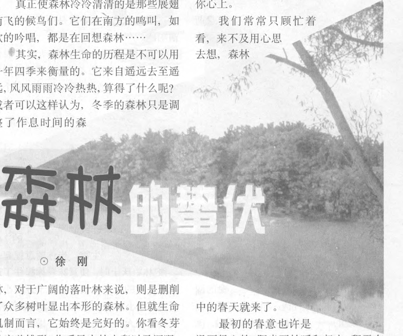 真正使森林冷冷清清的是那些展翅南飞的候鸟们。它们在南方的鸣叫,如歌的吟唱,都是在回想森林……