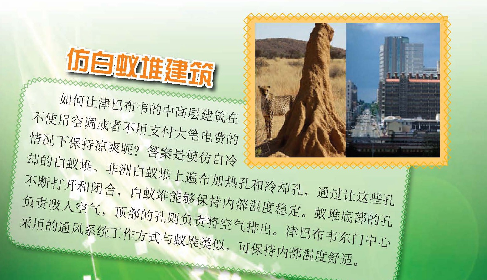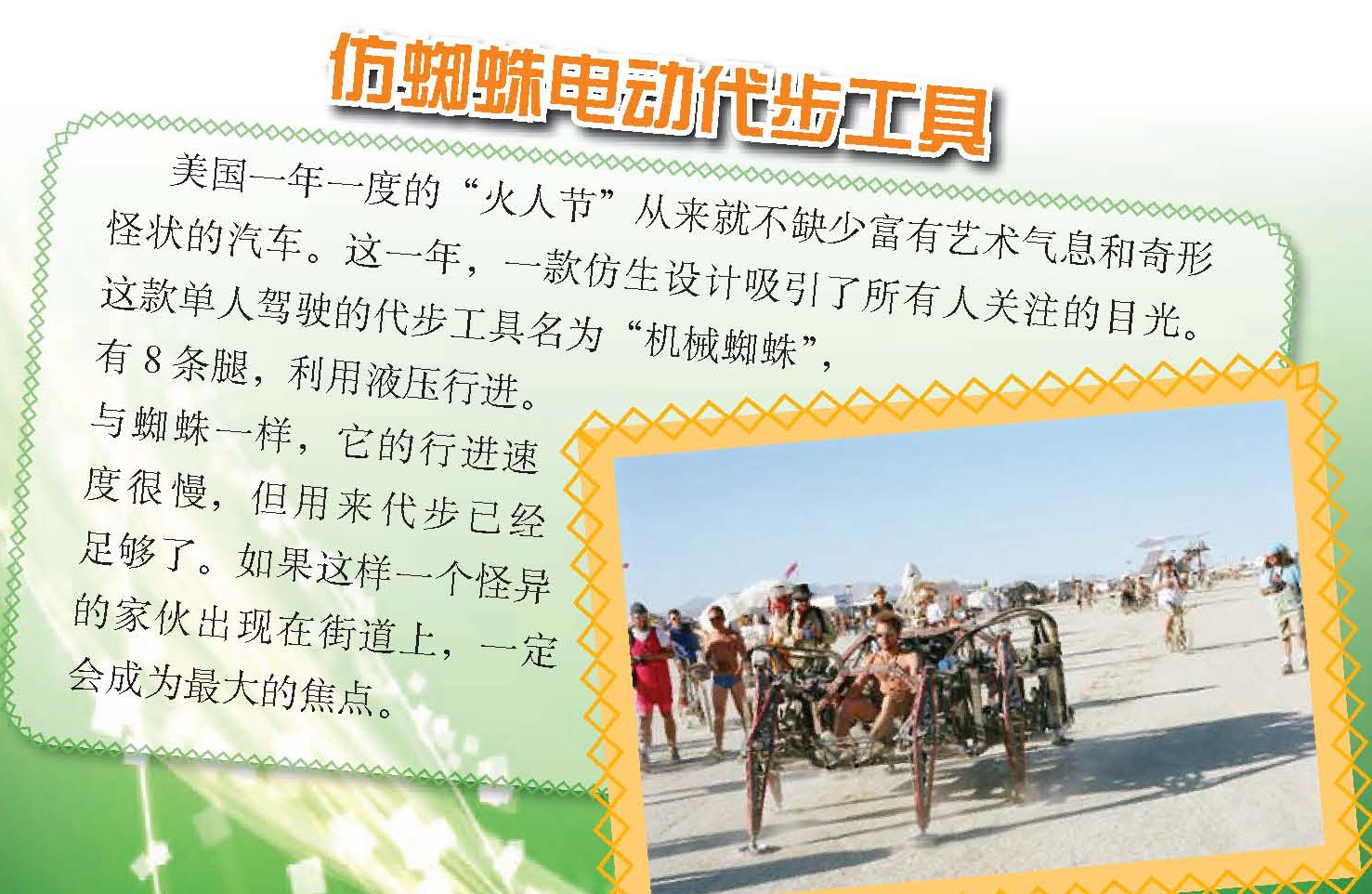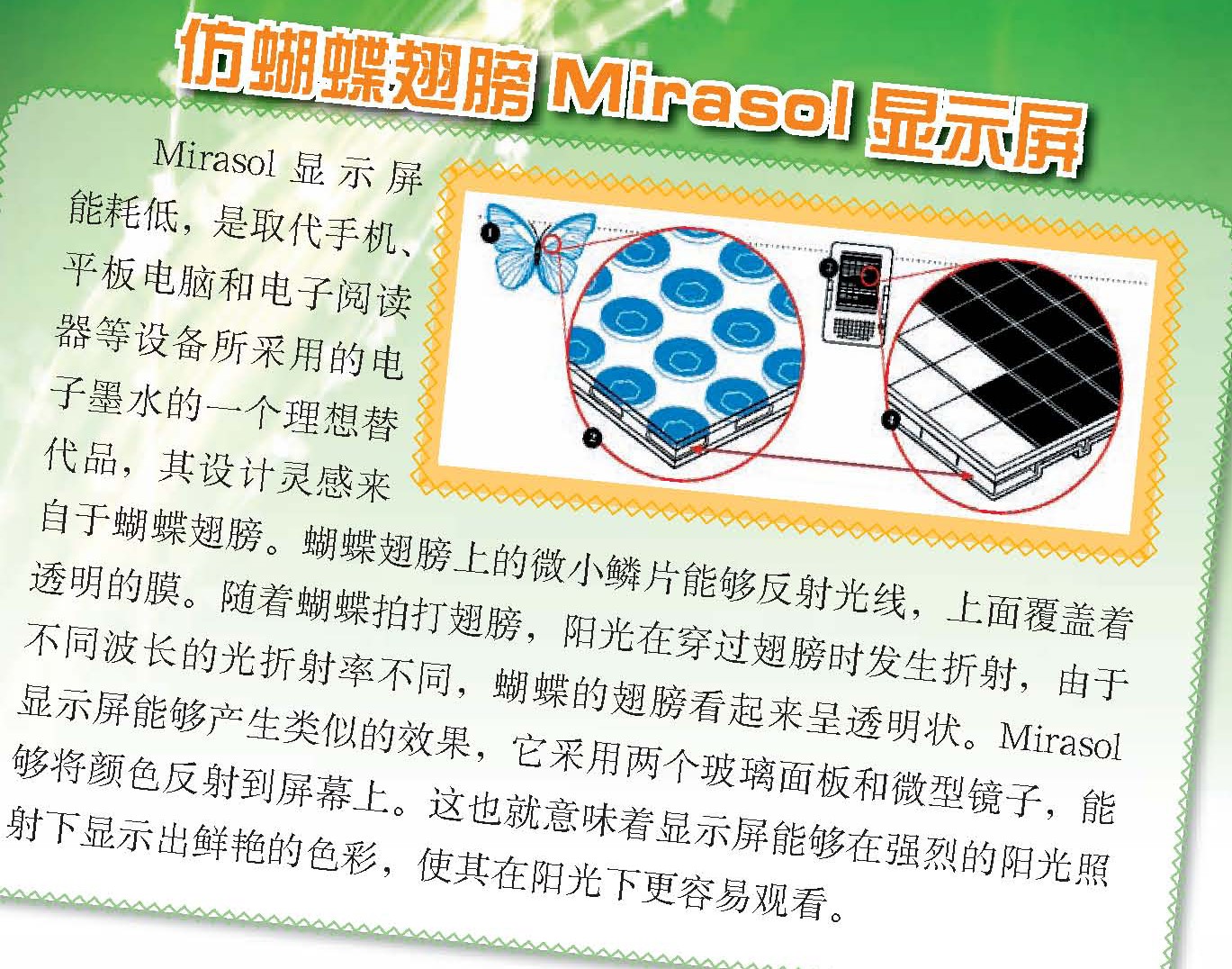 有一种巴西甲虫,尽管本身呈彩虹色,但不管从哪个角度?观察,它的鳞片总是呈现出绿色。虽然这种现象听起来没什么大不了的,但对于研制光学计算机芯片的科学家来说,这却是解决一个困扰了他们多年的问题的关键。这种甲虫的鳞片里含有一种晶体,内部结构与蜂巢类似,为光学计算所需的光子晶体提供了一个模型。