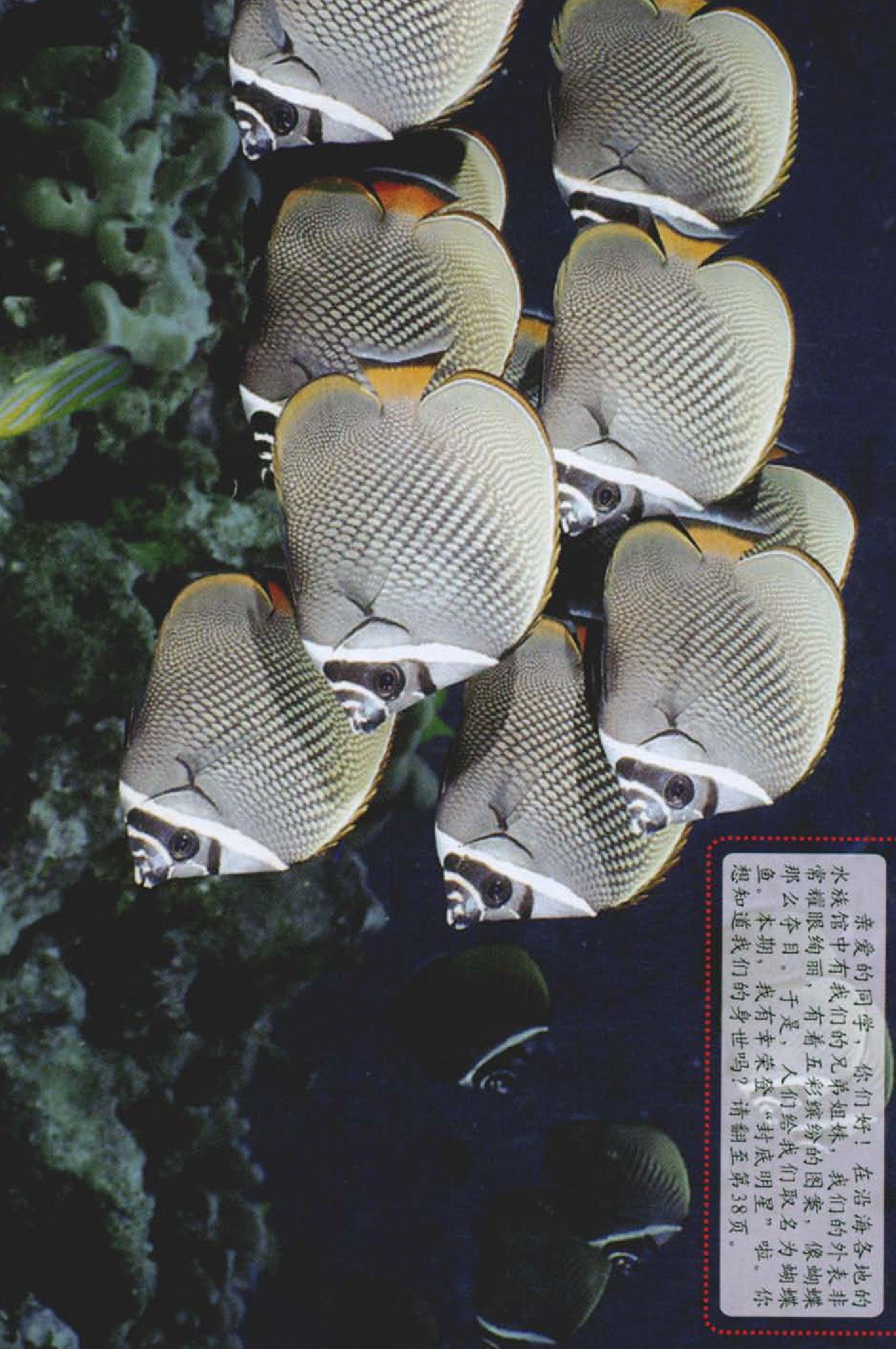 亲爱的同学,你们好!在沿海各地的水族馆中有我们的兄弟姐妹,我们的外表非常耀眼绚丽,有着五彩缤纷的图案,像蝴蝶那么夺目,于是,人们给我们取名为蝴蝶鱼,本期,我有幸荣登“封底明星”啦。你想指导我们的身世吗?请翻至第38页。