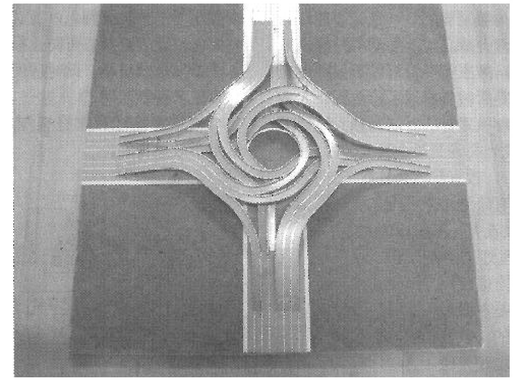 在机动车辆迅速发展、人口不断增加的当今社会,城市交通日益呈现拥挤现象,对于许多十字路口来说,的确需要建立互通式立交桥,以缓减交通压力。但是目前的互通式立交桥一般是由3~4层主桥组成,占地面积大,造价昂贵。所以在寸土寸金的绝大多数城市十字路口建立目前传统式的互通式立交桥是不现实的。于是我就想到了发明一种占地面积小、造价低、功能齐全、能全方位分流的互通式立交桥,那样就可以解决目前城市十字路口的交通难题了。