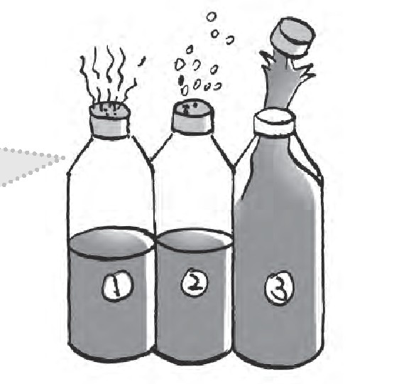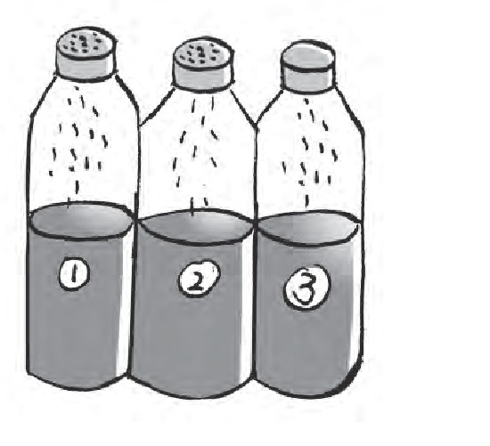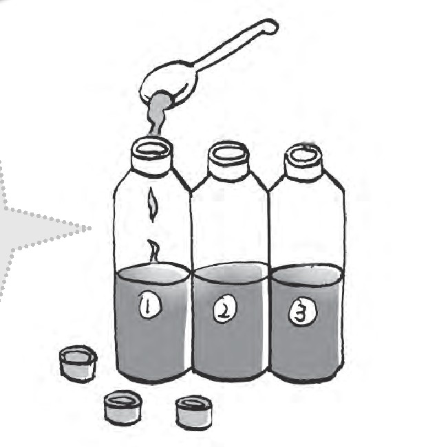 步骤2在三个空塑料瓶中分别倒上半瓶醋,将一匙玉米粉放进(1)号瓶里。