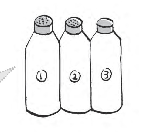 步骤3将三个瓶盖都翻过来,每个都放上小苏打粉末,然后都盖上盖子,其中(1)号瓶要盖上有孔的瓶盖。