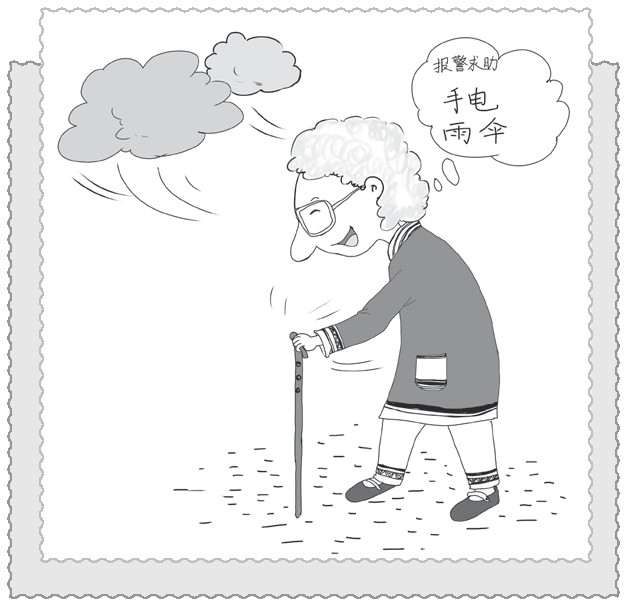老年人出行很不方便,我想制作一种专门给老年人用的拐杖,外形和普通拐杖差不多,就是增加了一些功能,我发明的拐杖有调控温度、报警求助、照明和充当雨伞的功能。