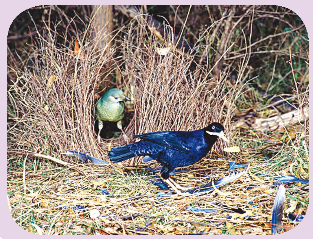 园丁鸟的求偶亭,造型非常别致。它们会先找来小树枝搭出亭子的架子,再用浆果汁染色,然后就会到处去寻找装饰品,比如颜色鲜艳的花朵、棕色的蜗牛壳、蓝色的吸管或瓶盖等。特别是亮蓝色的小石子,最受缎蓝园丁鸟的青睐,当雌鸟经过时,雄鸟就会衔起这些明亮的物品示爱呢。