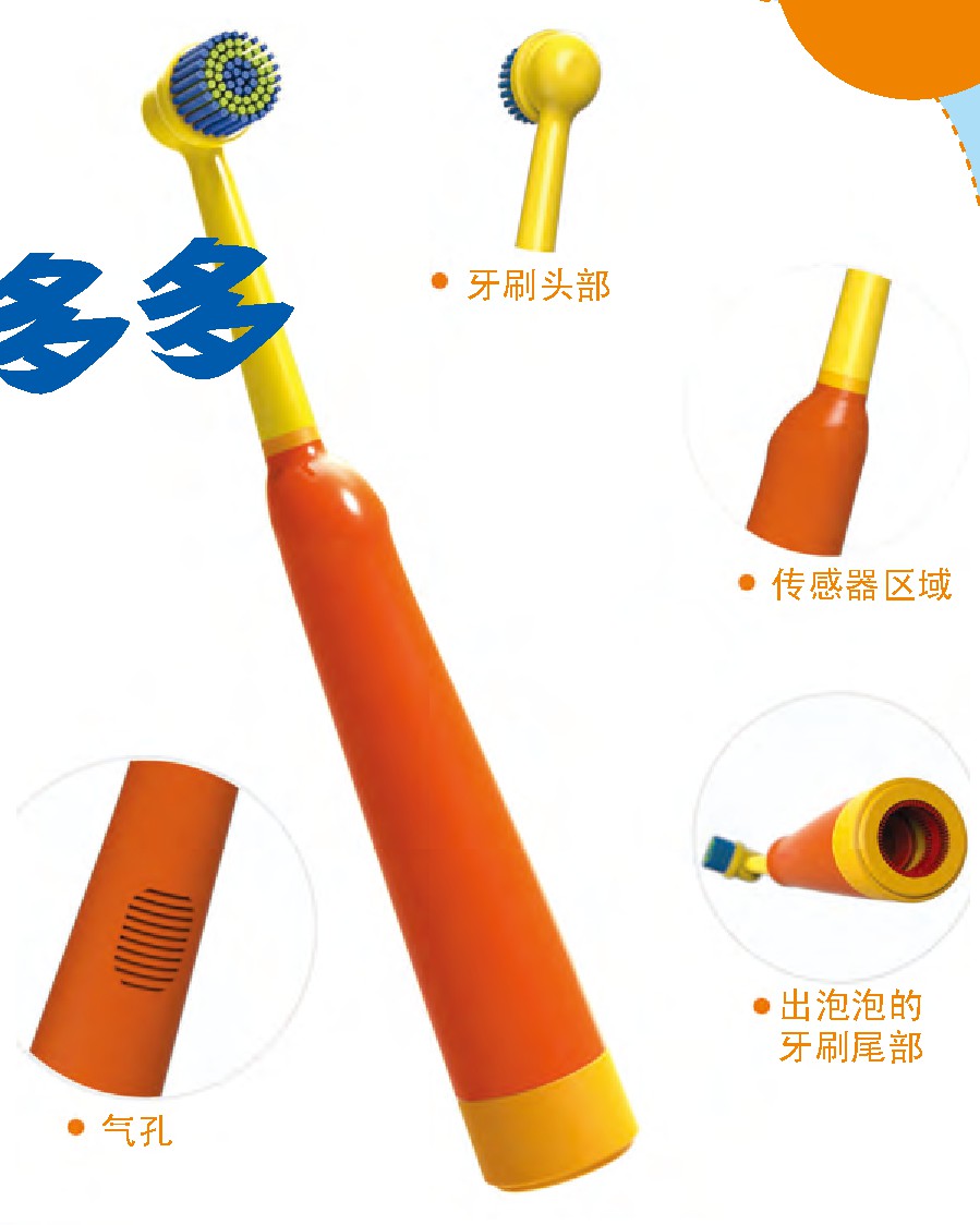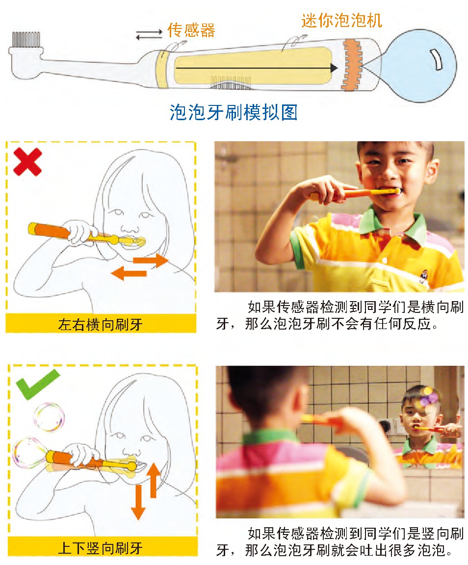 简单地说,泡泡牙刷既是牙刷,也是个能吹泡泡的玩具,同时还是一台智能设备。它内置的芯片能检测到牙刷的运动状态:是在往左右刷还是往上下刷,又或者是乱刷一通甚至是根本就没在刷。只要同学们使用了正确的刷牙方法,牙刷的尾部就会吹出泡泡,以示表扬。
