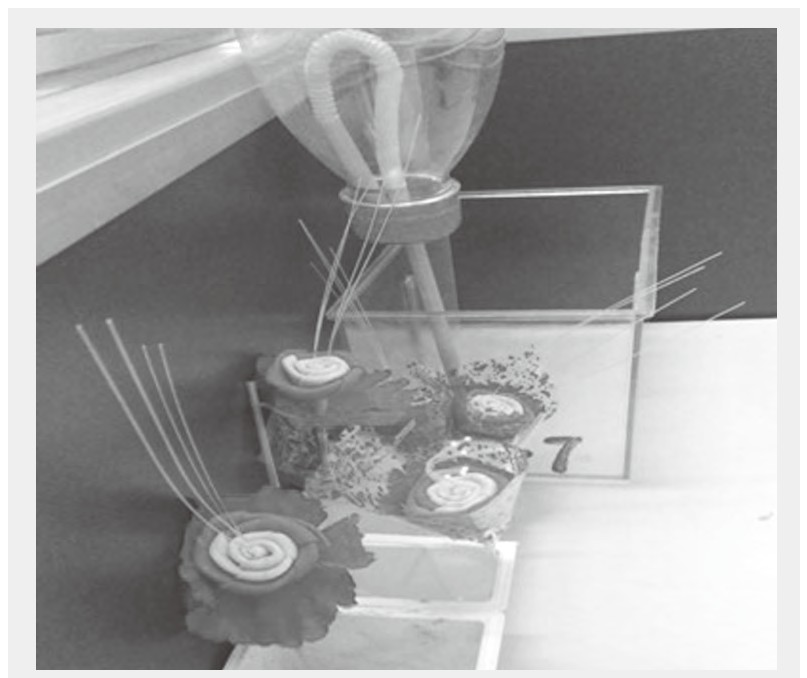 我们设想将阳光房的屋顶设计成V形,在V形的底部安装一排漏斗形雨水收集储存器,并制作了模型。收集储存器模型的制作步骤如下: