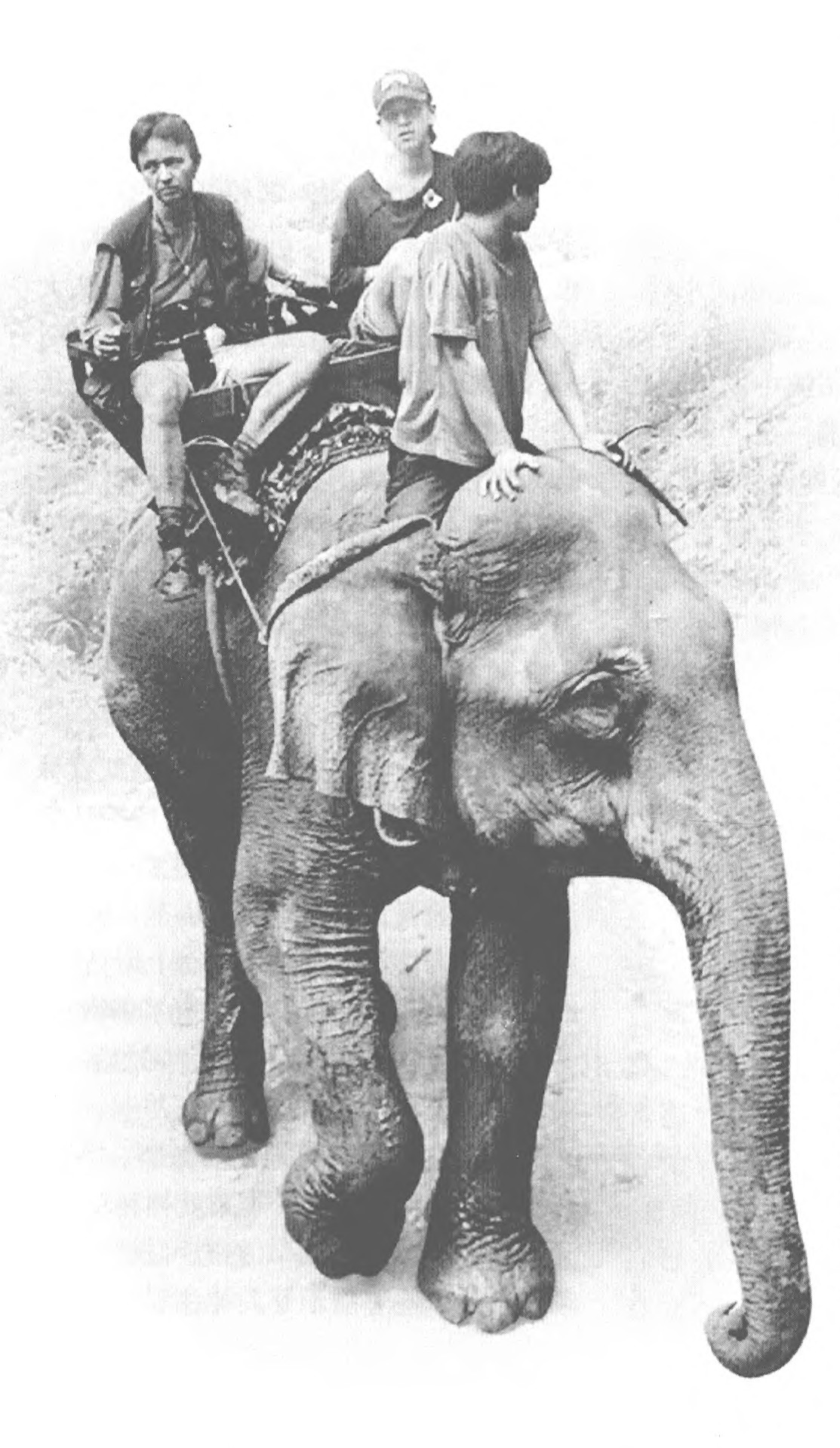 在野象谷,也并非随时随地都能看得到野象。也算是造化吧!笔者在野象谷盘桓两日,终于如愿以偿地看到了象群。一天上午10时许,我们在游览中,忽然发现谷底三岔河中一群象正在饮水,只见它们把长长的鼻子伸到水中,芭蕉叶般巨大的耳朵不停地摇动着。饮足了水后,几头野象便相互喷洒戏闹起来。两头小象如调皮的孩子在河水中翻滚,相互打闹,顿时,水浪飞溅,几头大象被漫天飞散的水珠笼罩。约半个多小时后,闹够玩足了的野象便抖了抖身上的水珠,缓缓爬上岸来,在一个小山头上一边晒太阳,一边悠闲地吃起竹叶、野芭蕉来。还有一天傍晚,暮色苍茫,朦胧中的原始森林逐渐从黛绿变为墨黑,林涛声声,犹如千军万马的呼吼,气势雄浑。有野鸟“咕咕”叫于山巅,此起彼伏……突然,附近树林中有枝叶掀动的声音传来,我们从“树上旅馆”里看去,只见从森林中走来了一群灰色的大象,大耳朵扑扇着,边走边用长鼻呼呼卷起地上的泥土抛洒在自己的脊背上,悠闲漫步至水塘边,相互依偎着饮水,玩耍,时而上岸擦痒、磨牙,时而仰头发出阵阵高昂的叫声,声若惊雷,威震林海。大约一个小时后,野象群才卷着草叶回到密林中去。