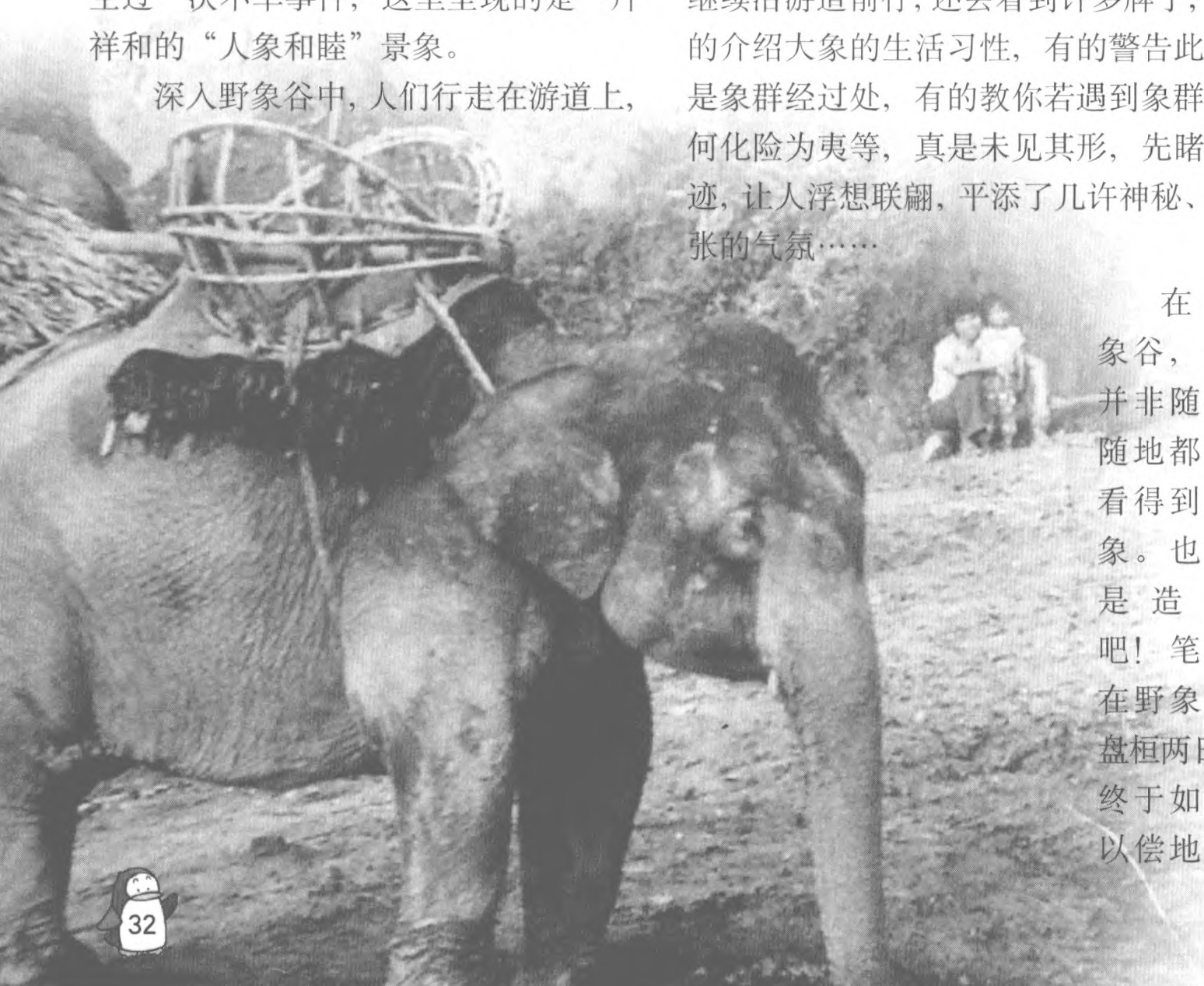 深入野象谷中,人们行走在游道上,呼吸着清新的空气,满眼是无边的绿色,鸟鸣声声,婉转动听,让人感到说不出的惬意,世事的烦恼早被荡尽,回归大自然的喜悦油然而生。当游客正自得其乐时,会看到古树上的警示牌:“注意,野象通道,小心通过。”仔细观察,你会发现山坡林间有一小道通向林间小溪,一个个圆而巨大的脚印深陷在溪边沙滩上,这无疑是野象经常来溪中饮水、嬉戏,天长日久践踏而成的一条“象道”。继续沿游道前行,还会看到许多牌子,有的介绍大象的生活习性,有的警告此处是象群经过处,有的教你若遇到象群如何化险为夷等,真是未见其形,先睹其迹,让人浮想联翩,平添了几许神秘、紧张的气氛……