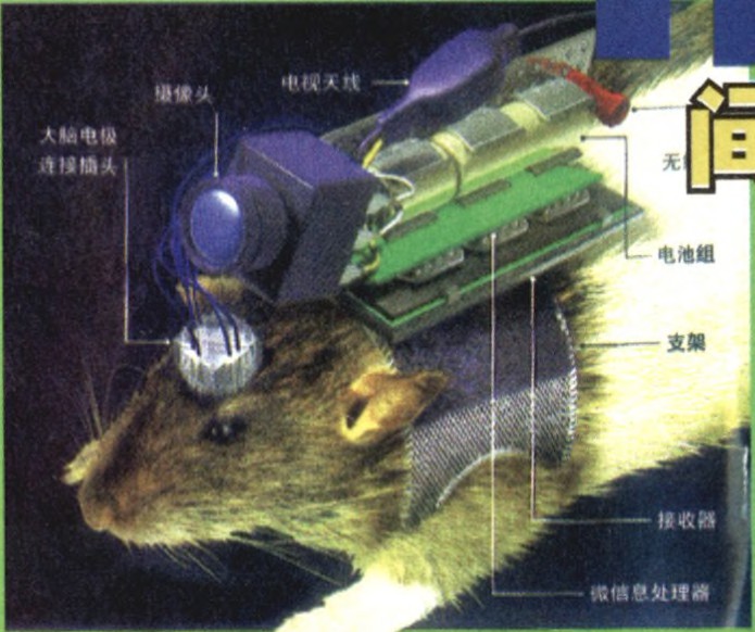 最近,在美国布鲁克林州立大学的医疗中心,自然学家制造出一种遥控器来控制活老鼠的行为。当老鼠背上安置好具有发射、接收功能和袖珍摄像头的装置后,操纵者在500米远处也能控制它通过复杂的地形,在倒塌的建筑物中发现幸存者,或进入雷区探测危险,甚至还能完成一名间谍的使命呢!