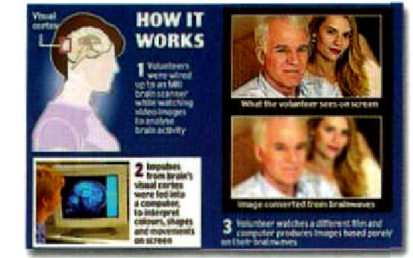 美国科学家最新研究出一种读心仪器,能够将测试者正在看到的或者记忆的画面呈现在计算机屏幕上。这种研究脑波活动模式的仪器能够“读懂”人们的大脑活动,并以动态图像显示在计算机屏幕。虽然这一心灵感应式的仪器概念听起来有点儿像科幻电影中的情节,但科学家称未来有一 天将用于处理犯罪案件。