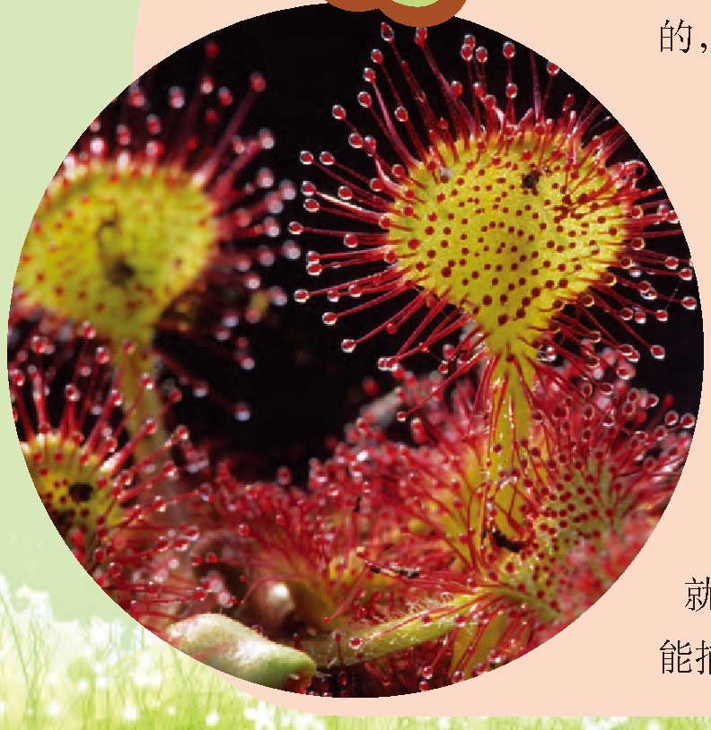 茅膏菜就是施展“诱捕”诡计的能手。它的叶子上长了许多红色长毛,每根长毛顶上还挂着一颗亮晶晶的小液滴,在阳光的照射下显得分外晶莹可爱。实际上,这些液滴是一种极黏的分泌物。一旦飞虫被那液滴艳丽的外表吸引,只要一落上去,立即就会被粘住。这时,长毛会一点点向小虫聚拢、弯曲,把它裹进叶子里。接着消化腺开始工作,两天后,小虫就会被吸空。