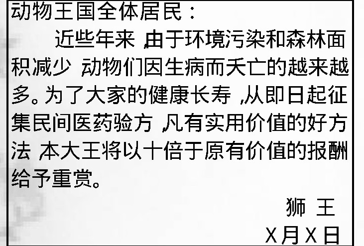 椋鸟先生飞进王宫对狮王说:“我们椋鸟从来不生病。如果我把这个不生病的秘方献出来,你能够奖励我吗?”