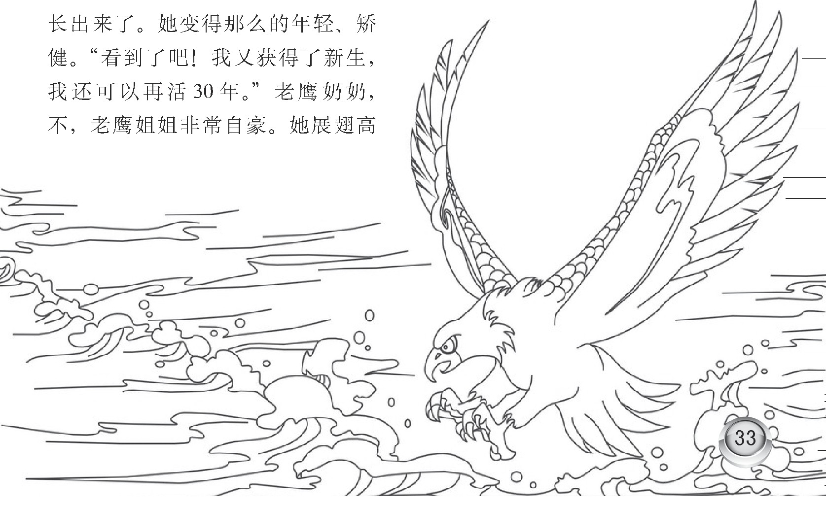 “为了换来新生!”老鹰说,“我必须要这样做,我不想等死。”老鹰奶奶把自己变成了一只光毛鹰。