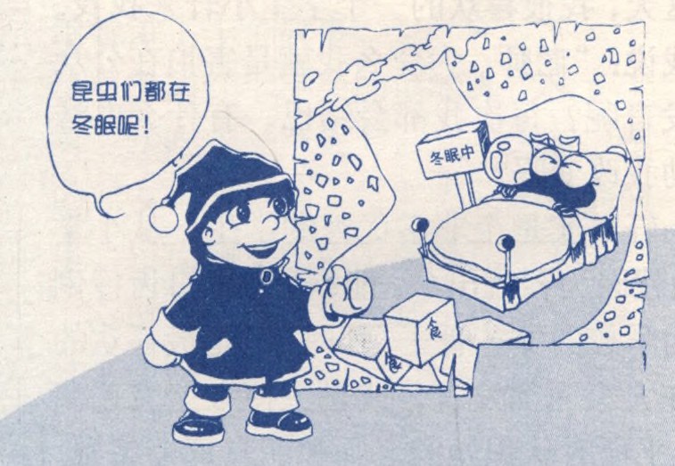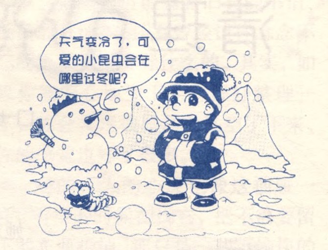 大博士:的确,一到了寒冷的冬季,昆虫们就不见了踪影。除了某些一年生的昆虫冬天会死掉以外,大部分昆虫都到哪去了呢?其实,昆虫也有自己的办法:既然冬天不能出来活动,它们就得想办法冬眠,这是昆虫生存的本能。