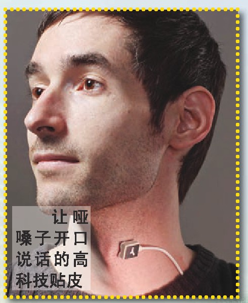 当我们想说话时,大脑会把神经信号传递给声带,我们就可以开口说话。然而,有些患者因为天生声带残疾而说不出话来。美国研究人员开发出一种高科技贴片,贴在喉部就可以破译出大脑传递给嗓子的神经信号,然后变成电子信号传输给电脑,让电脑帮助患者说话。这种发明也可以帮助那些暂时嗓子变哑的人开口说话。
