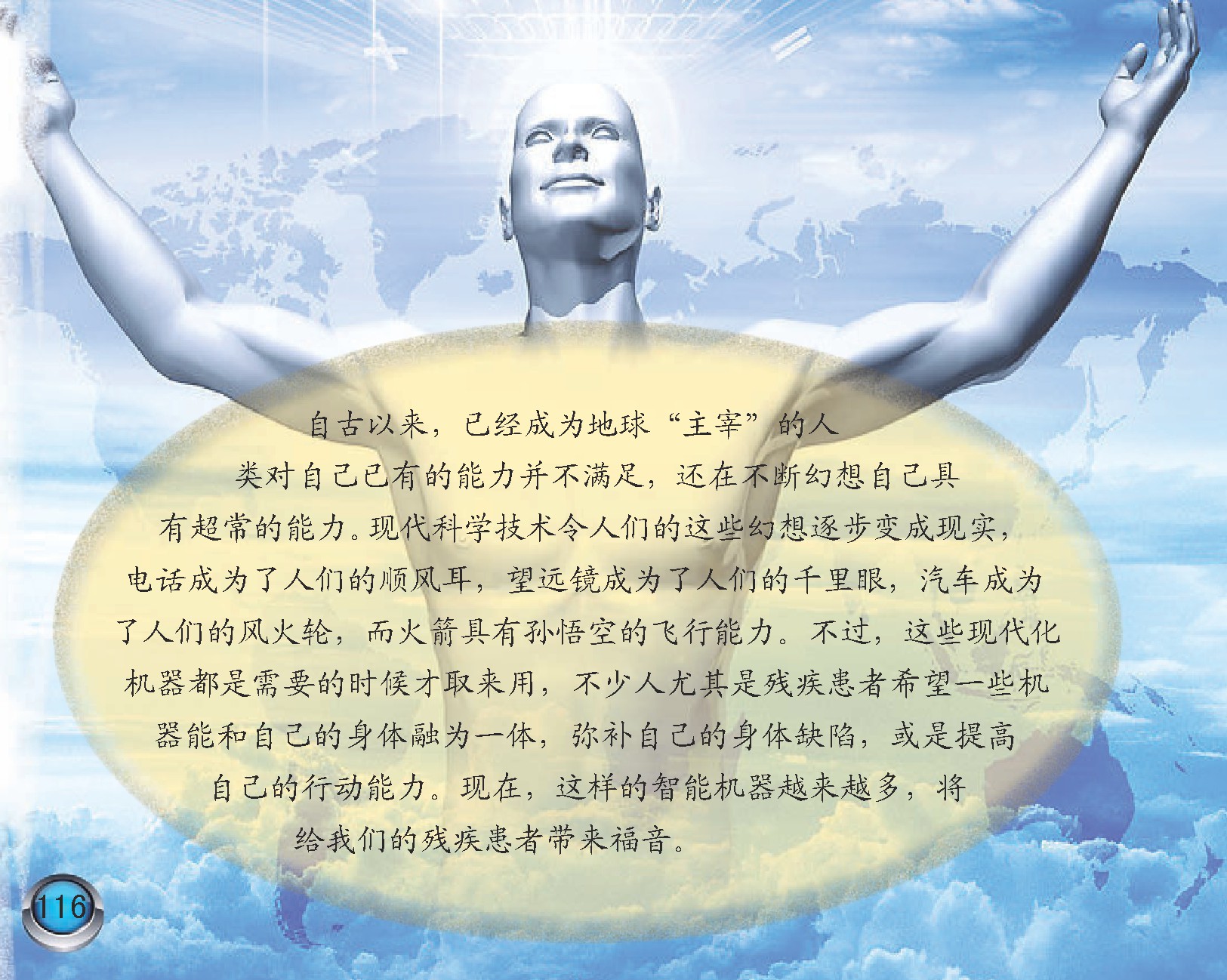 自古以来,已经成为地球“主宰”的人类对自己已有的能力并不满足,还在不断幻想自己具有超常的能力。现代科学技术令人们的这些幻想逐步变成现实,电话成为了人们的顺风耳,望远镜成为了人们的千里眼,汽车成为了人们的风火轮,而火箭具有孙悟空的飞行能力。不过,这些现代化机器都是需要的时候才取来用,不少人尤其是残疾患者希望一些机器能和自己的身体融为一体,弥补自己的身体缺陷,或是提高自己的行动能力。现在,这样的智能机器越来越多,将给我们的残疾患者带来福音。