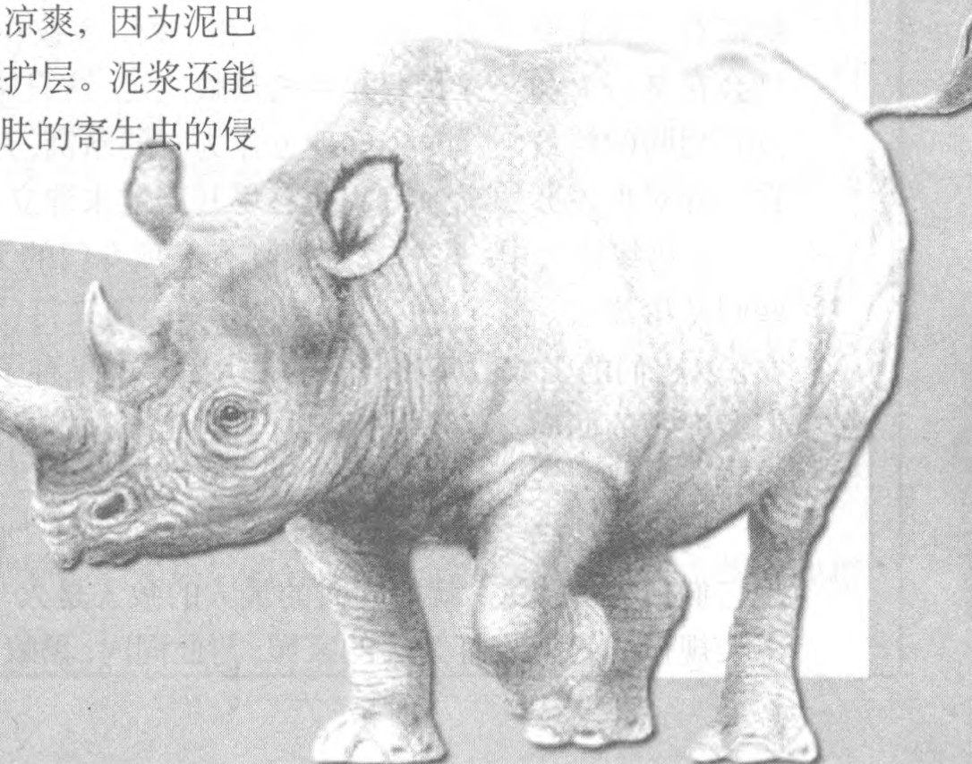 洗泥浆浴对犀牛来说很舒适。结块的泥巴在炎热天气里使它感觉很凉爽,因为泥巴给它加了一层抵御烈日的保护层。泥浆还能防止一些会咬的小虫和钻皮肤的寄生虫的侵扰。