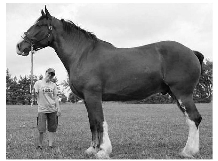 世界上最高的马生活在加拿大一家农场里。它今年10岁,站立时从头顶到地面的高度约为2.05米。当身高1.61米、重达58千克的主人站在它旁边时,看起来就像是一个小孩子。
